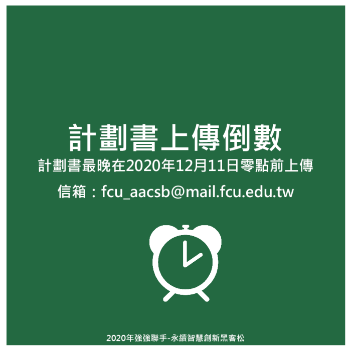 1️⃣提案計劃書(A4):需涵蓋需求洞察、創意企劃構想、目標對象、市場調查分析、目標設定及執行規劃,提案內容須以各命題為主軸。計劃書格式為不包含封面20頁內(包含附錄),中文字體標楷體12級,英文字體TimesNewRoman12級,並請於最晚在2020年12月11日(星期五)00:00前將提案計劃書寄至信箱:fcu_aacsb@mail.fcu.edu.tw,主旨:強強聯手-永續智慧創新黑客松企畫書/選擇企業/組長名字