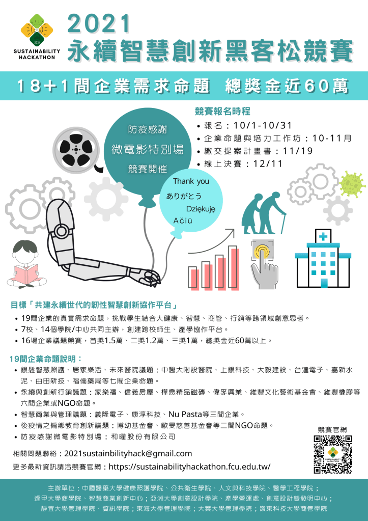 「2021永續智慧創新黑客松競賽」活動由中國醫藥大學、逢甲大學、亞洲大學、靜宜大學、東海大學、大葉大學及嶺東科技大學等7校共同舉辦,這項競賽邀請18間企業針對銀髮智慧照護、居家樂活、未來醫院議題與NGO的真實命題,以取得更多有利於解決方案設計的回饋,總獎金高達55萬元。